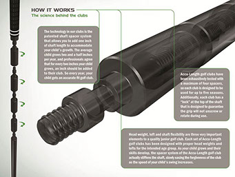 The AL500 Series is available for children 36.5” to 46.5” inches in height. Each self standing bag contains a 500 series wood, pitching wedge, and putter. A 7-iron is available for separate purchase. The bags are available in either royal blue (shown above) or soft pink.